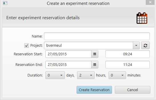 After you have selected all the nodes and channels you want to use, you can make a reservation, by clicking the Reserve button at the top of jFed. This will show you this dialog box where you can fill in the right parameters.